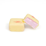 Cubes, 3 x 3 cm, indulgent marshmallows with strawberry flavour covered with an extra layer of premium Belgian white chocolate.