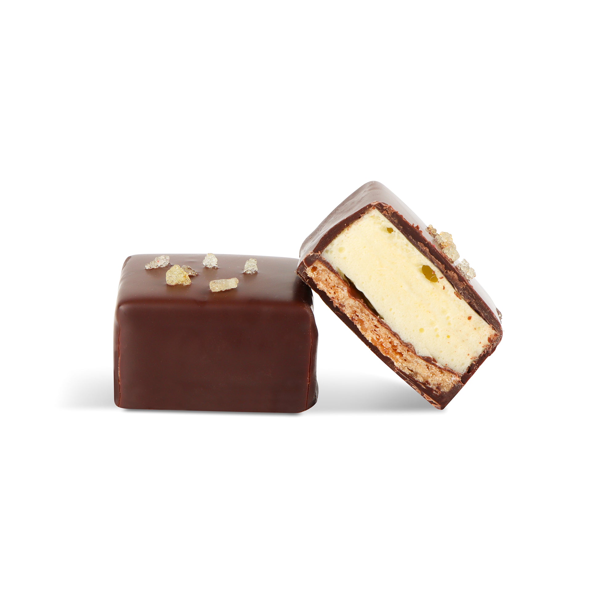 Squares 3.5 x 3.5 cm, indulgent marshmallow with lemon and cookie covered with a thin layer of premium Belgian dark chocolate